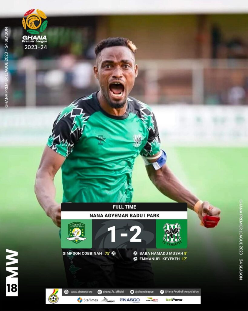 FC Samartex defied the odds to beat former Ghana Premier League champions Aduana Stars at the Nana Agyemang Badu I Park in Dormaa-Ahenkro on Monday to maintain their top spot on the league table.