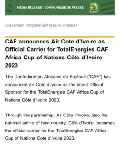 Air Cote d’Ivoire has been announced as the official sponsor for the CAF Africa Cup of Nations, Côte d’Ivoire 2023, as revealed by the Confederation of African Football (CAF).