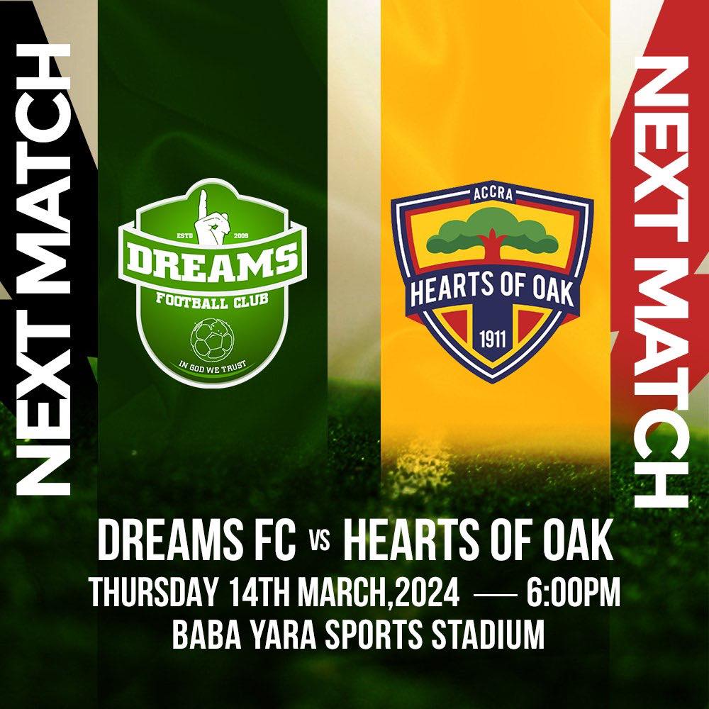 Dreams FC will host Accra Hearts of Oak at the Baba Yara Sports Stadium on Thursday in their Week 21 clash of the Ghana Premier League, the Ghana FA has announced.