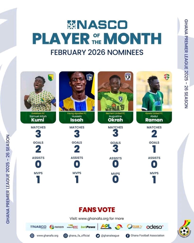 The Ghana Football Association (GFA) has released the shortlist for the February Ghana Premier League Player of the Month award, featuring four outstanding performers who impressed during the period.