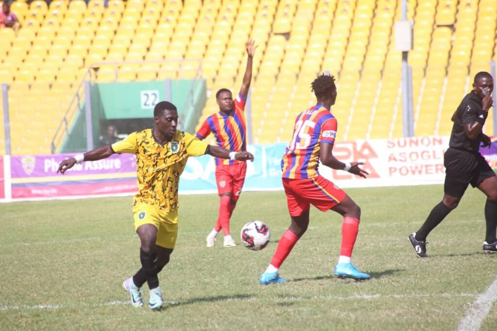 Hearts of Oak player, Asamoah Boateng Afriyie came closer to leveling the score but goalkeeper Abdul Wahab Abubakari came to the rescue of the newly promoted side.