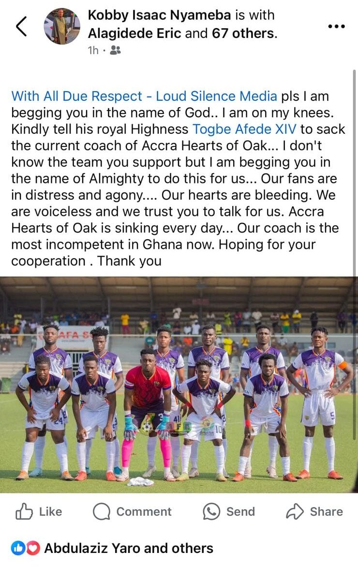 Following their 1-1 stalemate with Vision FC on Sunday, some passionate supporters of Accra Hearts of Oak have made a public appeal to media personality Kevin Taylor, urging him to intervene in the club’s current coaching situation by reaching out to club board chairman Togbe Afede XIV.