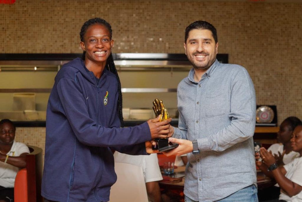 The Ghana women’s national football team shot-stopper was presented with the Golden Glove trophy by organizers at the squad’s hotel in Sharjah.
