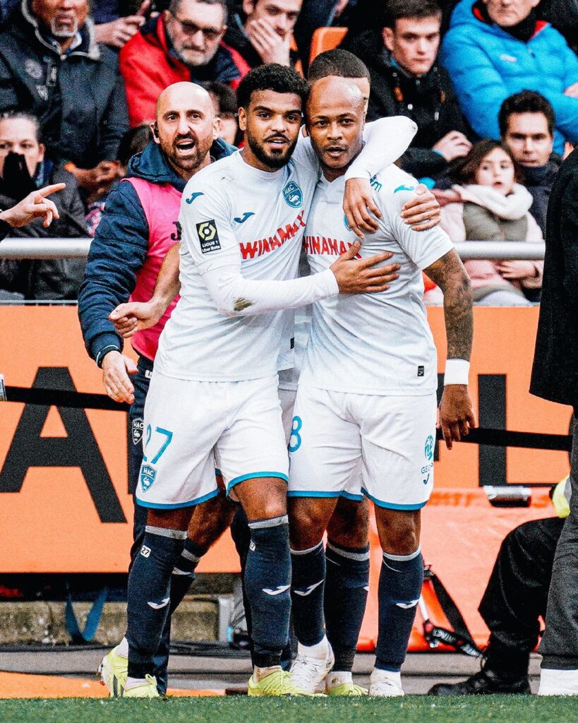Ghana captain Andre Ayew climbed off the bench to score twice for Le Havre in their pulsatoling 3-3 draw against Lorient in French Ligue 1 on Sunday .